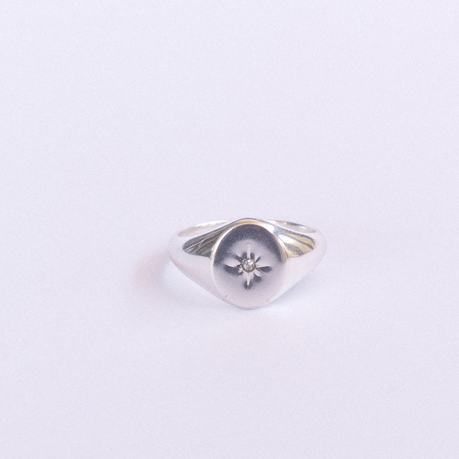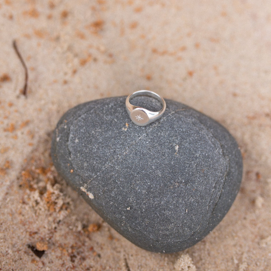 Classy, dainty, and made to wear every day. The Rosa de los Vientos ring features a subtle compass rose engraving — perfect as a pinky ring or on the ring finger. Shiny polished 925 silver with tiny cubic zirconia stones adds just the right sparkle.