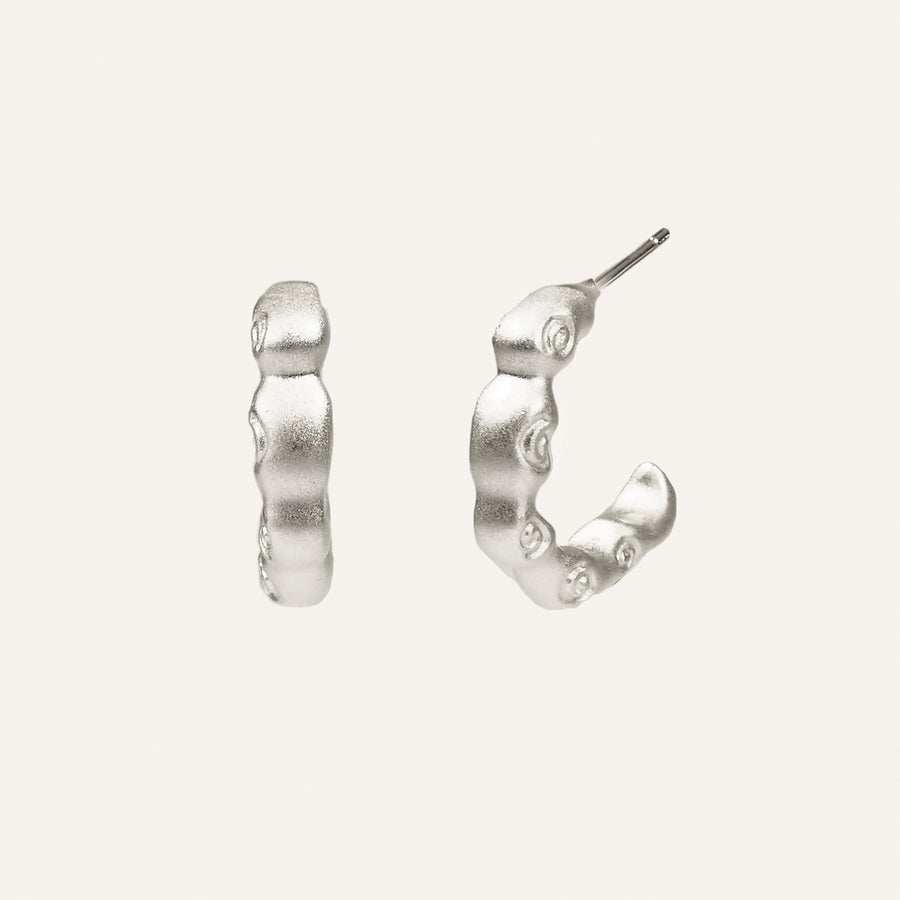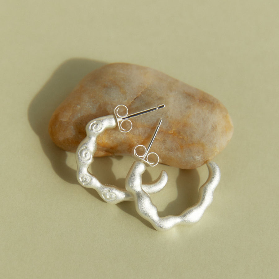 Inspired by the natural beauty of Cala Mitjana, these hoops feature uneven curves and subtle spiral shell embossings, bringing organic texture and effortless elegance to a classic shape. A wearable piece of art that celebrates life’s flow.