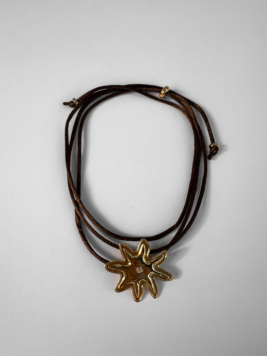 Flower charm: brass, 18k gold plated Cord: silky mocha mousse Total length: 116 cm Fully adjustable.