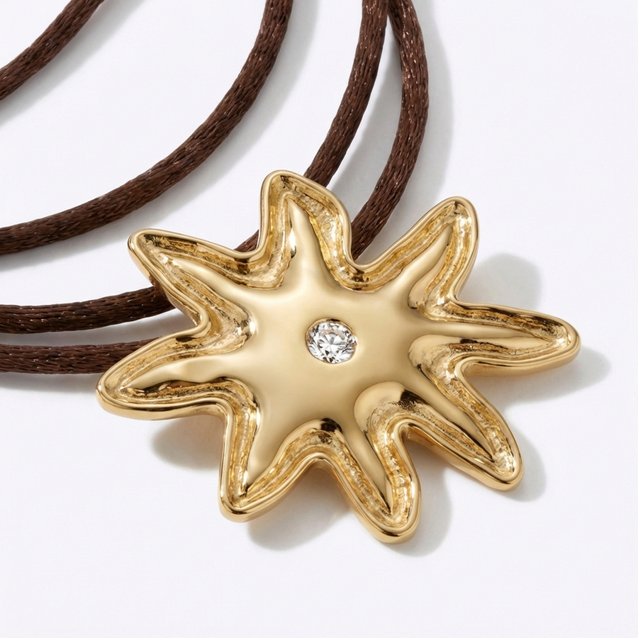 Wearing complements? Yes, but make it effortless. The Stern Cord Necklace is your go-to statement without trying too hard. Lightweight, silky, and subtly bold — it elevates even the simplest outfit. Finished with an 18k gold-plated brass flower and a soft mocha-mousse cord, designed to move with you. Adjust it your way. Wear it long, short, or somewhere in between.