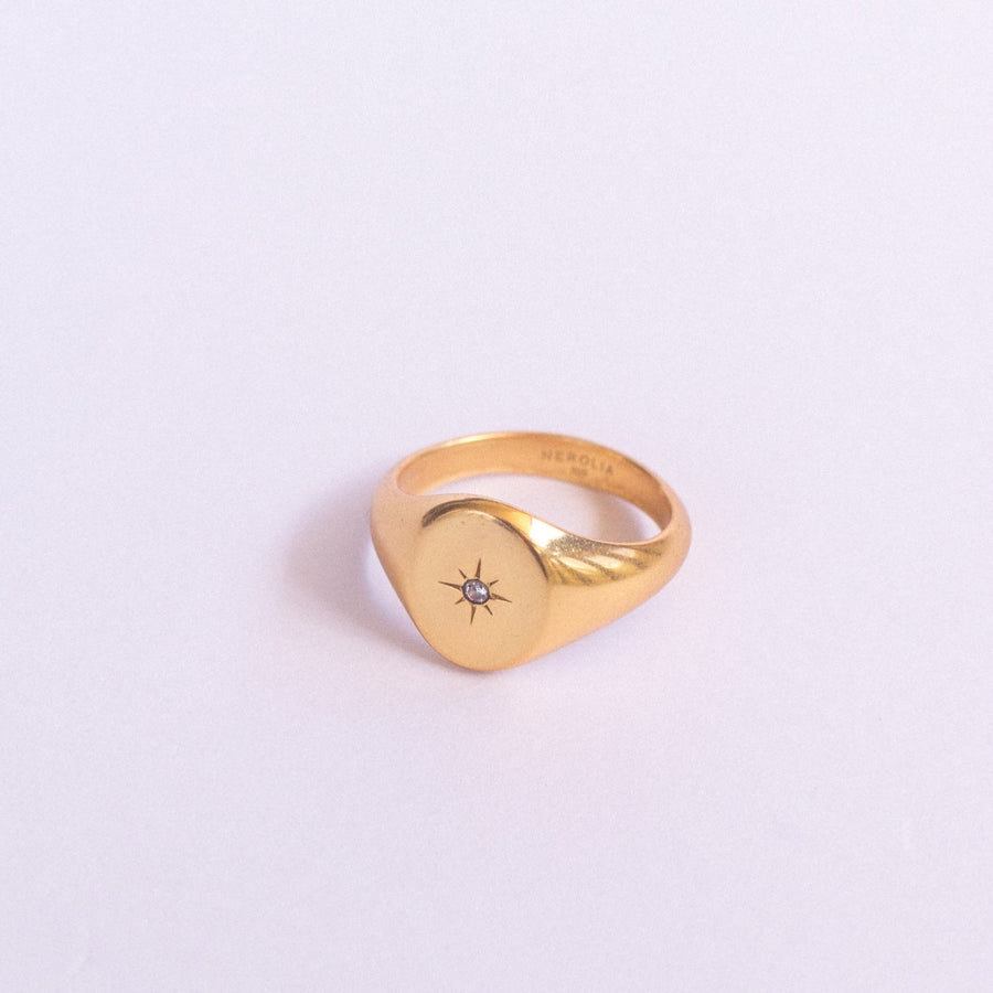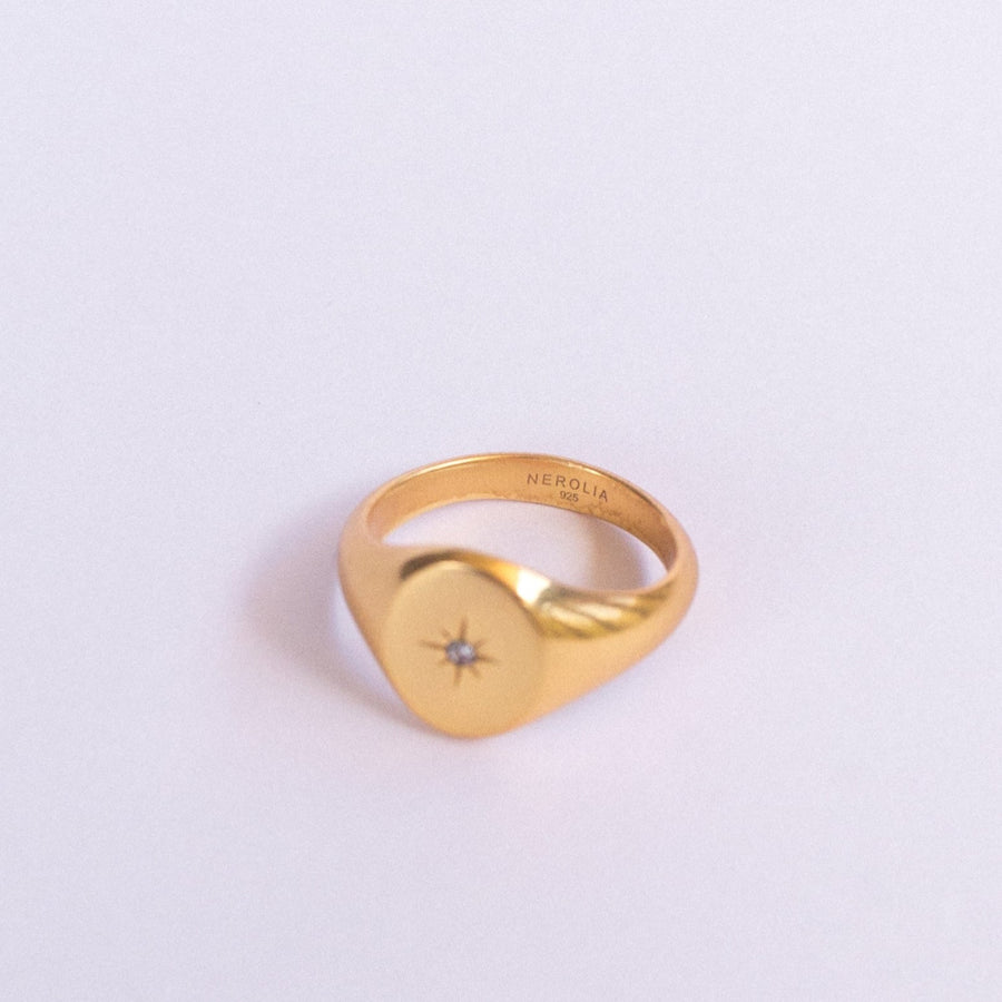 Classy, dainty, and made to wear every day. The Rosa de los Vientos ring in gold-plated brass features a subtle compass rose engraving — perfect as a pinky ring or on the ring finger. Shiny polished finish with tiny cubic zirconia stones adds just the right spark.