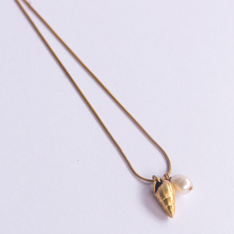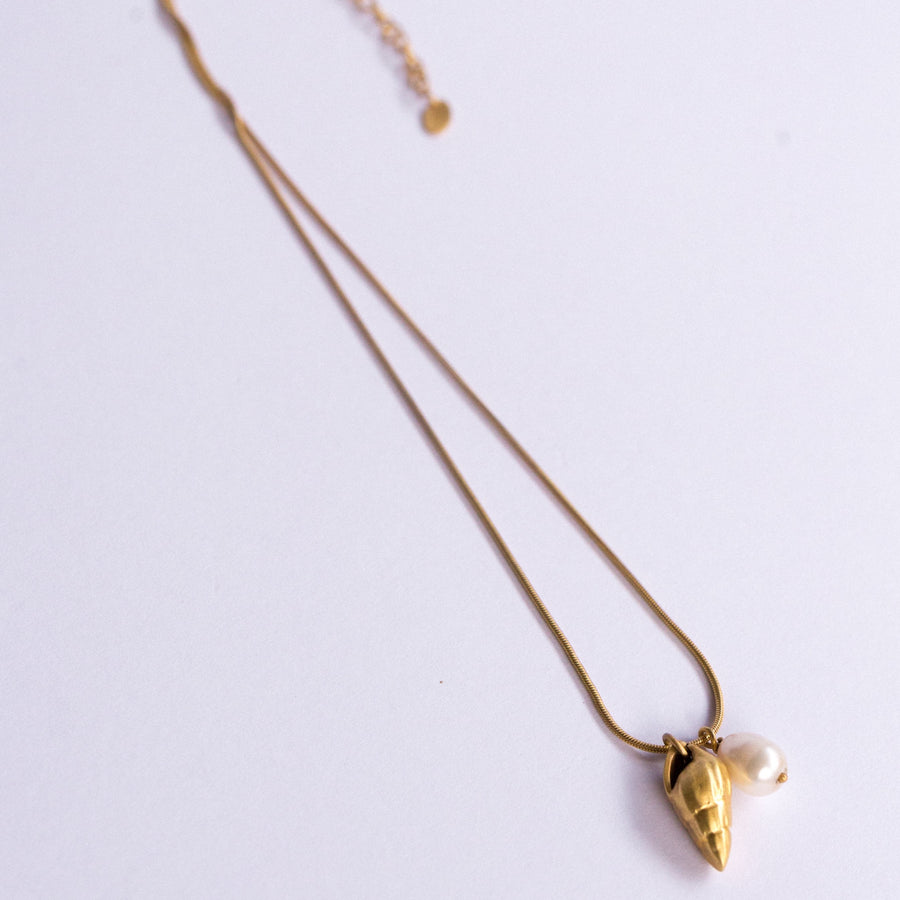 18k Gold vermeil Chain Type: Handmade snake round chain, 1 mm thick Length: Adjustable 43–48 cm Pendants: Natural shell (1.5 cm) & freshwater pearl (5 mm) Finishing: Matte Weight: 3 g