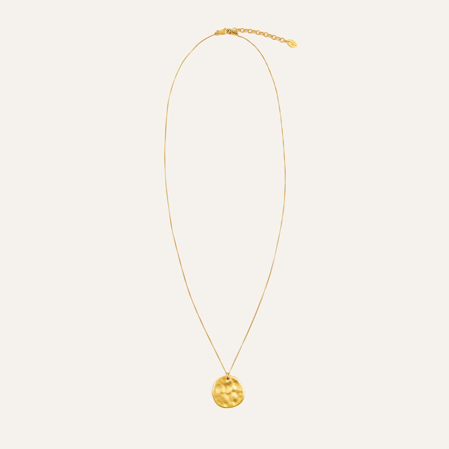 18K gold-plated vermeil Chain Type: Handmade vine chain, 1 mm thick Length: Adjustable 50–55 cm Pendant: Round, 2 cm diameter, matte finish Weight: 5g