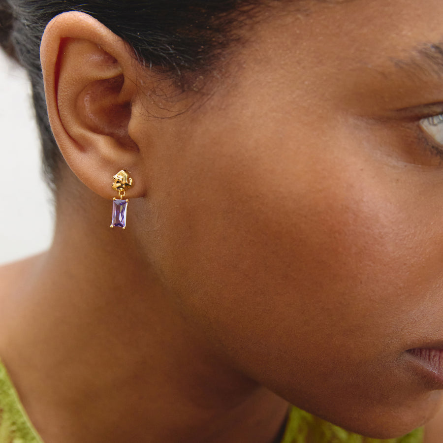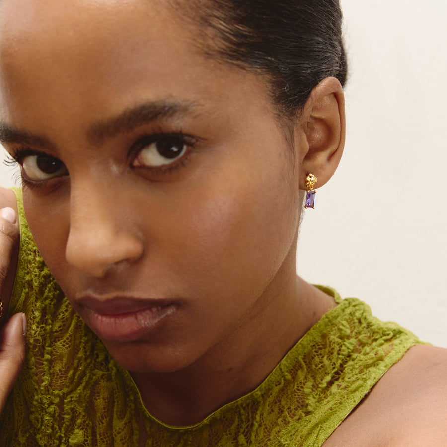 Earring dimensions: 6 mm Stones: Amethyst Cubic Zirconia Stone dimension: 4x8 mm Finishing: Shiny Polish. Weight: 1.5 g