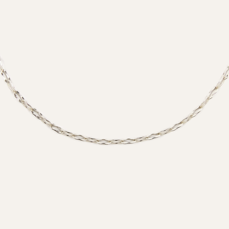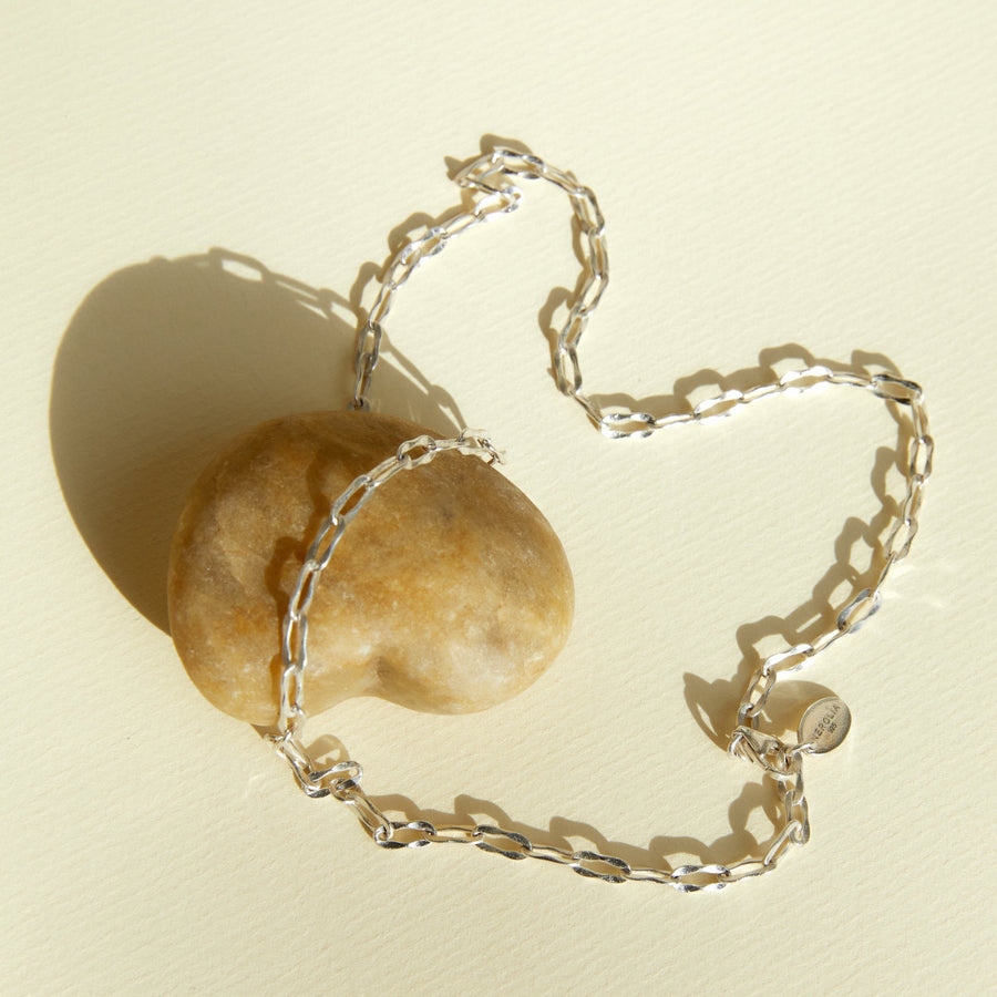 925 recycled silver Chain Type: Handmade paperclip chain, 4 mm Length: 40 cm total, adjustable at 33 cm Finishing: Shiny polish Weight: 2.5 g