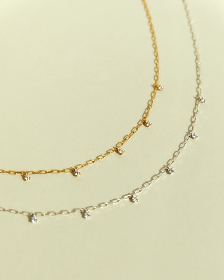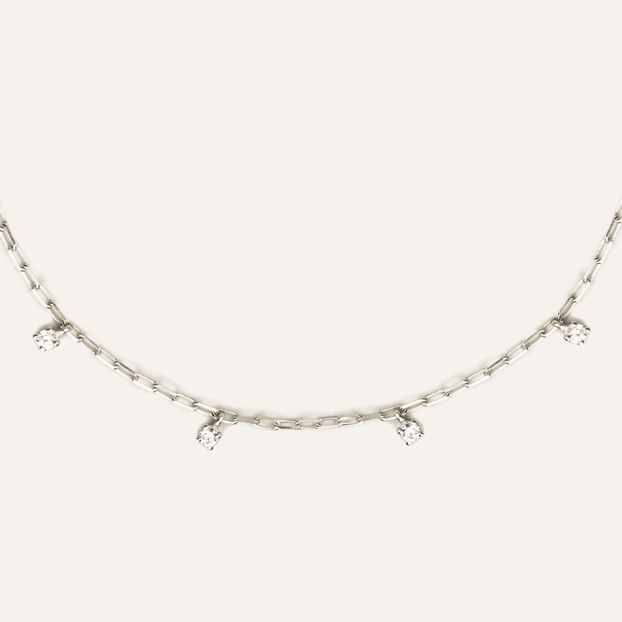 925 recycled silver Chain Type: Handmade paperclip chain, 2 mm Length: 39.5 cm total, adjustable at 33.5 & 36.5 cm Crystals: 6 round cubic zirconia (3 mm) Finishing: Shiny polish Weight: 2.5 g