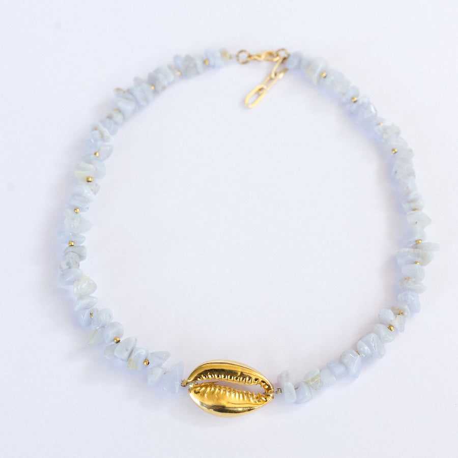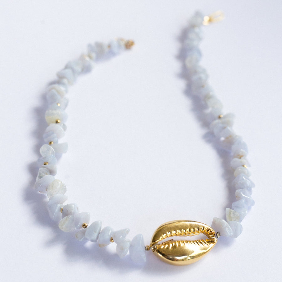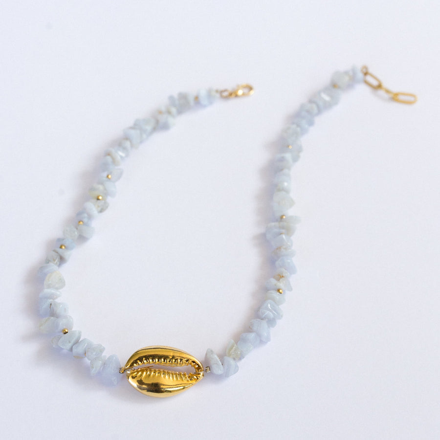 Bring a bit of that summer feeling with the Ursula Necklace. A lucky charm made of a Gold Plated Shell casted from a natural shell that I collected from Brazil. Also with Blue Lace Agate gemstones. Blue Lace Agate is a good general healing stone. Crazy lace agate is commonly referred to as the "laughter stone," or "happy lace." It's a balancing and protecting stone, believed to ward off the "evil eye," bringing joy and absorbing emotional pain. Some other properties of Lace Agate Purifying energy. Boosting personal energy levels. Promoting positive vibrations. Rejuvenating inner strength. Encourages self-confidence.
